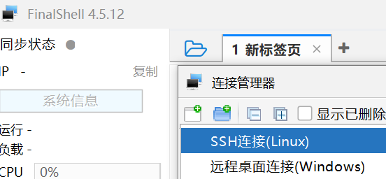安装完成之后,打开Finalshell,点击文件夹图标打开连接管理器,点击左上角的白色背景的加号图标,选择SSH连接(Linux)。