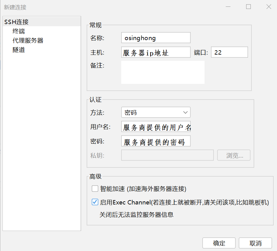 在新建连接界面中,填写服务器的IP地址,用户名和密码。这些信息服务器商都会提供。