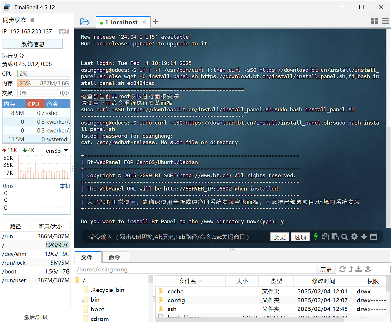 注意:如果你的服务器已经自带宝塔面板,请在终端输入“bt 14”即可获得面板地址及账号密码,并开放所要求的端口(前往服务商处添加安全组规则)。请跳过此步骤。