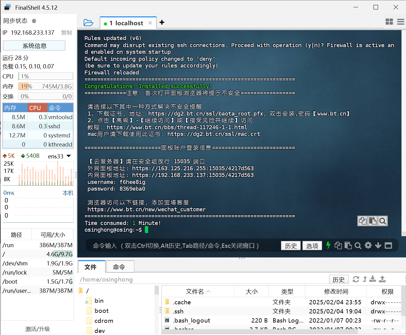 安装时间从2分钟到10分钟不等,根据你的服务器带宽速度决定。安装完成后,系统会提供你的面板地址及账号密码,并要求你开放指定的服务器安全组端口。