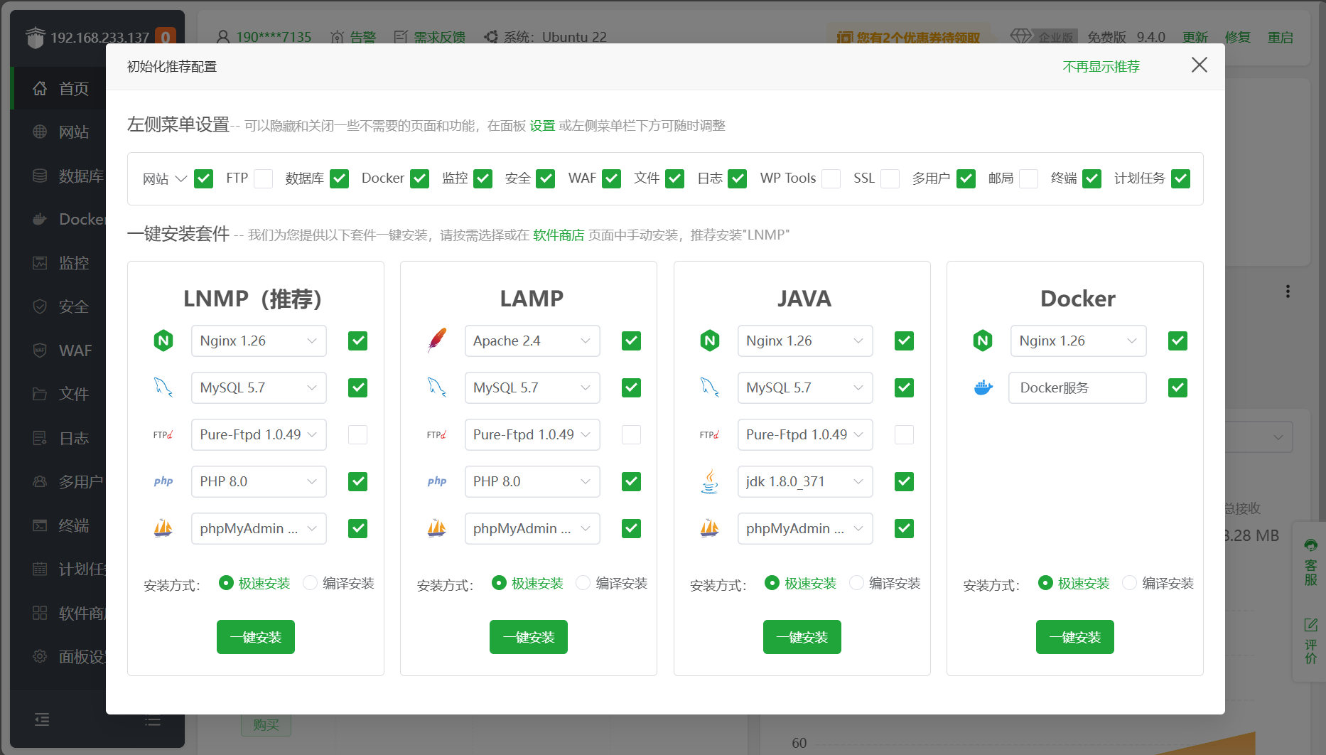 登录之后会提示安装套件,可以安装LNAP(推荐)或者LAMP二选一。