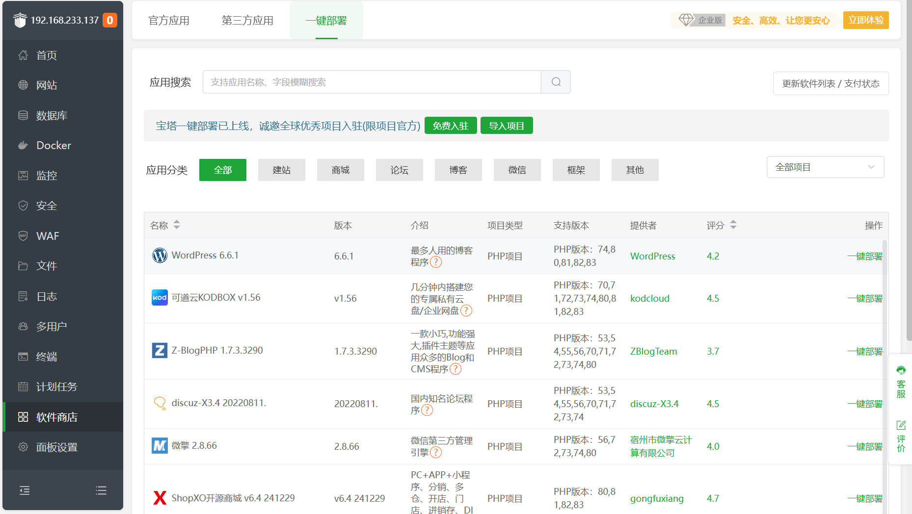 等待套件全部安装完成,打开右下角的软件商店,然后点击上方的一键部署,就可以看到很多能够一键部署的应用。
