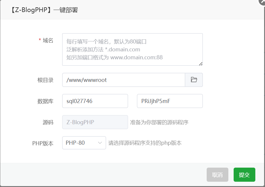 选择Z-BlogPHP进行一键部署,只需要填写之前准备的已解析的域名即可,然后提交。